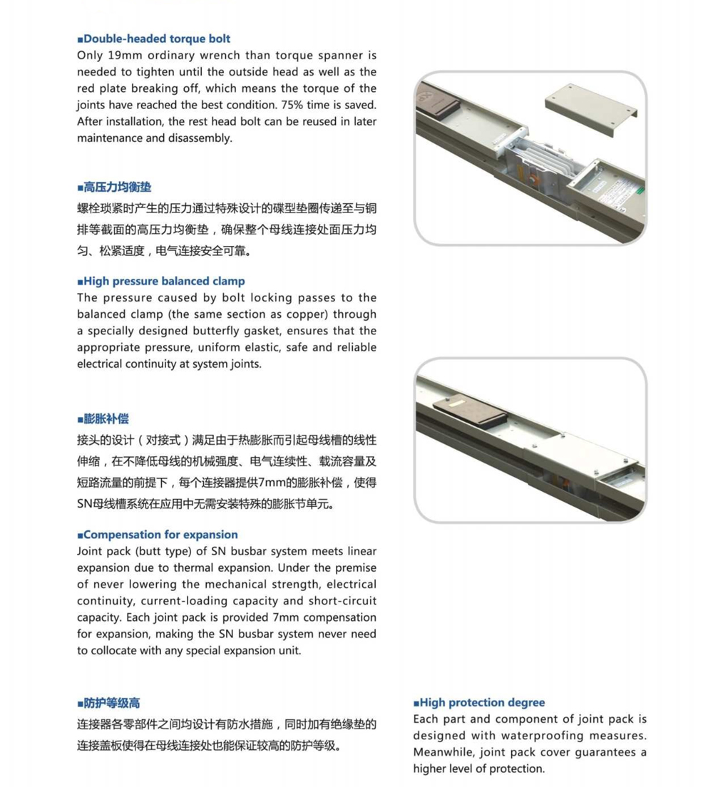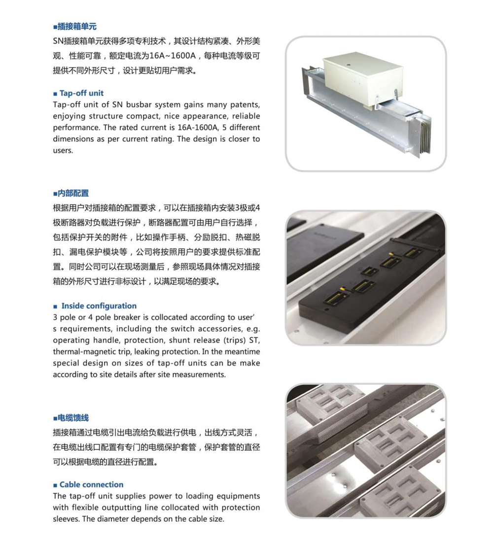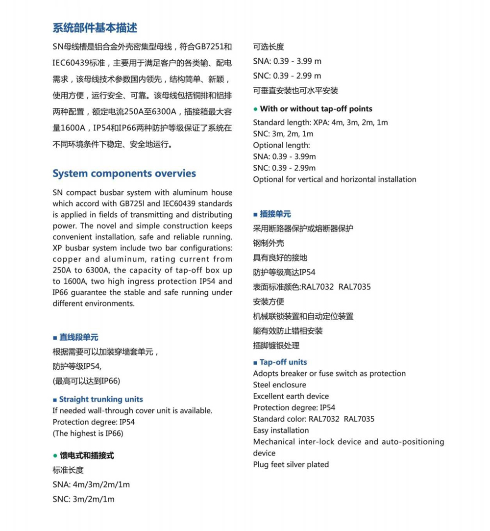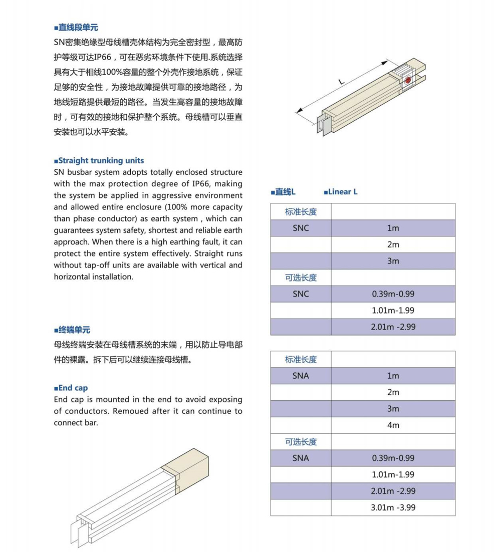 SN母线槽是铝合金外壳密集型母线,符合GB7251和1EC60439标准,主要用于满足客户的各类输、配电需求,该母线技术参数国内领先,结构简单、新颖, .使用方便,运行安全、可靠。该母线包括铜排和铝排两种配置,额定电流250A至6300A,插接箱最大容量1600A , IP54和IP66两种防护等级保证了系统在不同环境条件”下稳定、安全地运行。