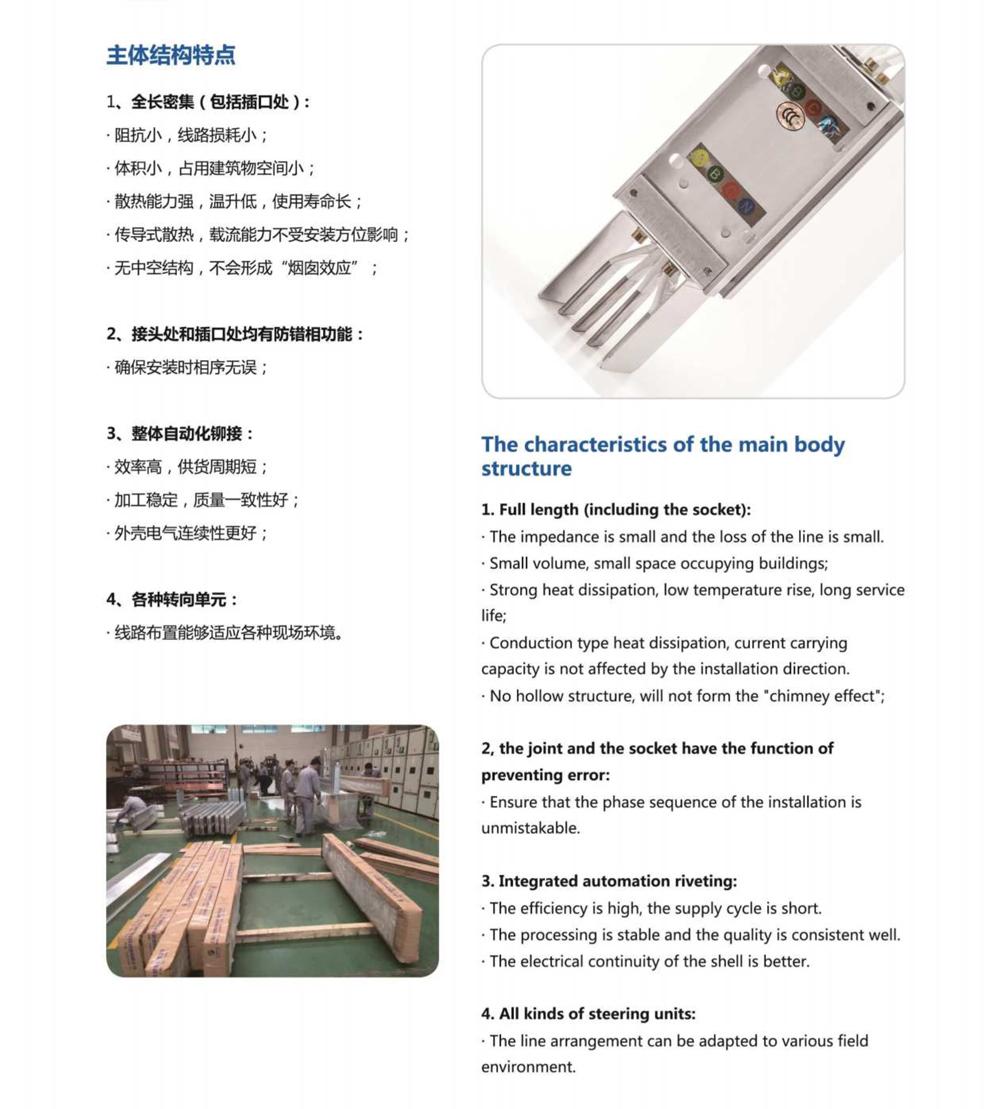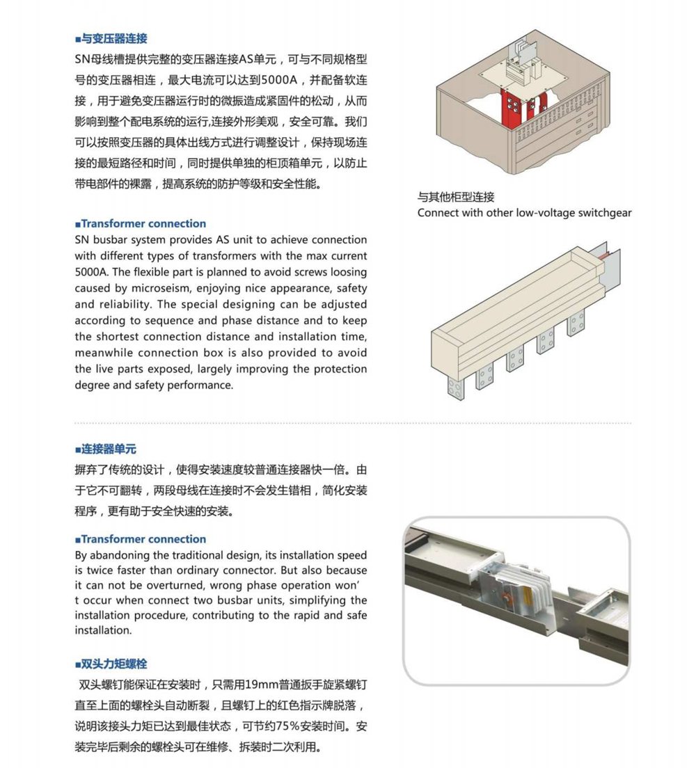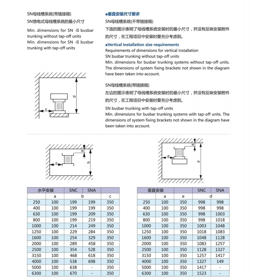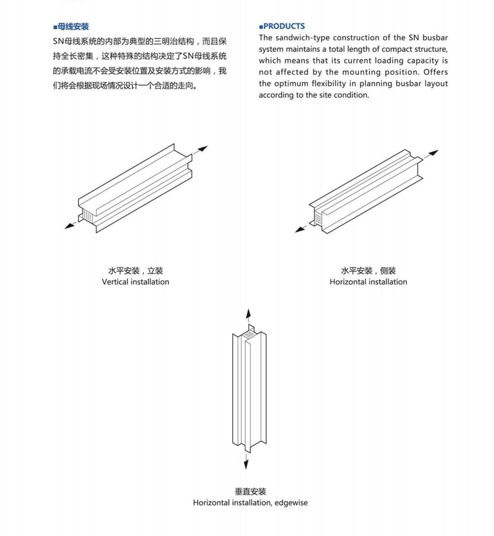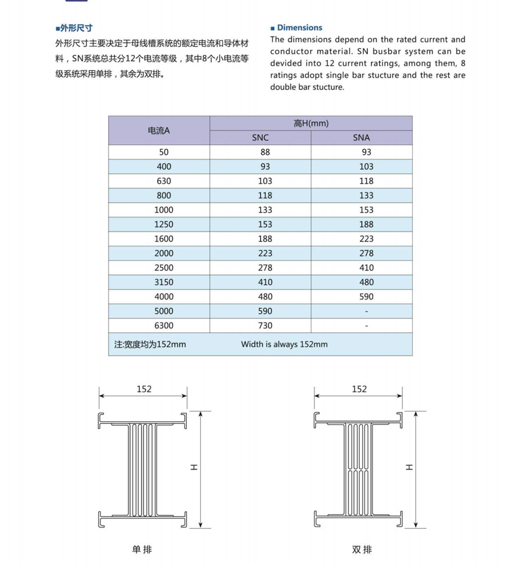 SN母线槽是铝合金外壳密集型母线,符合GB7251和1EC60439标准,主要用于满足客户的各类输、配电需求,该母线技术参数国内领先,结构简单、新颖, .使用方便,运行安全、可靠。该母线包括铜排和铝排两种配置,额定电流250A至6300A,插接箱最大容量1600A , IP54和IP66两种防护等级保证了系统在不同环境条件”下稳定、安全地运行。