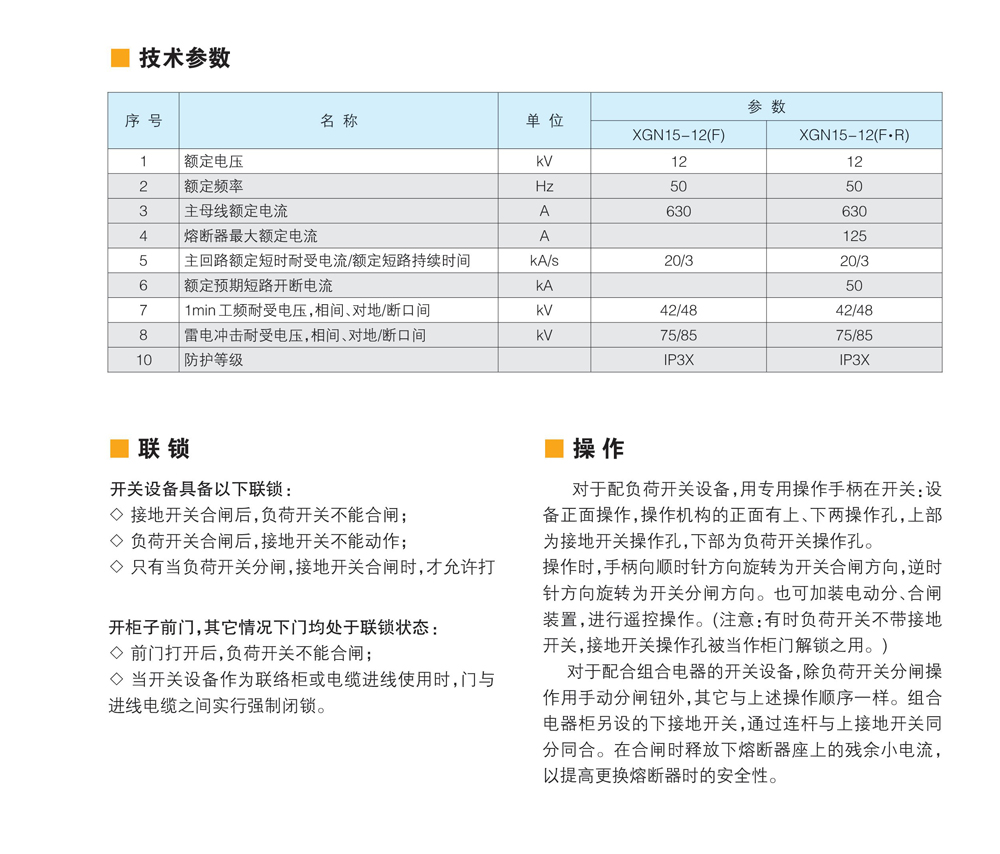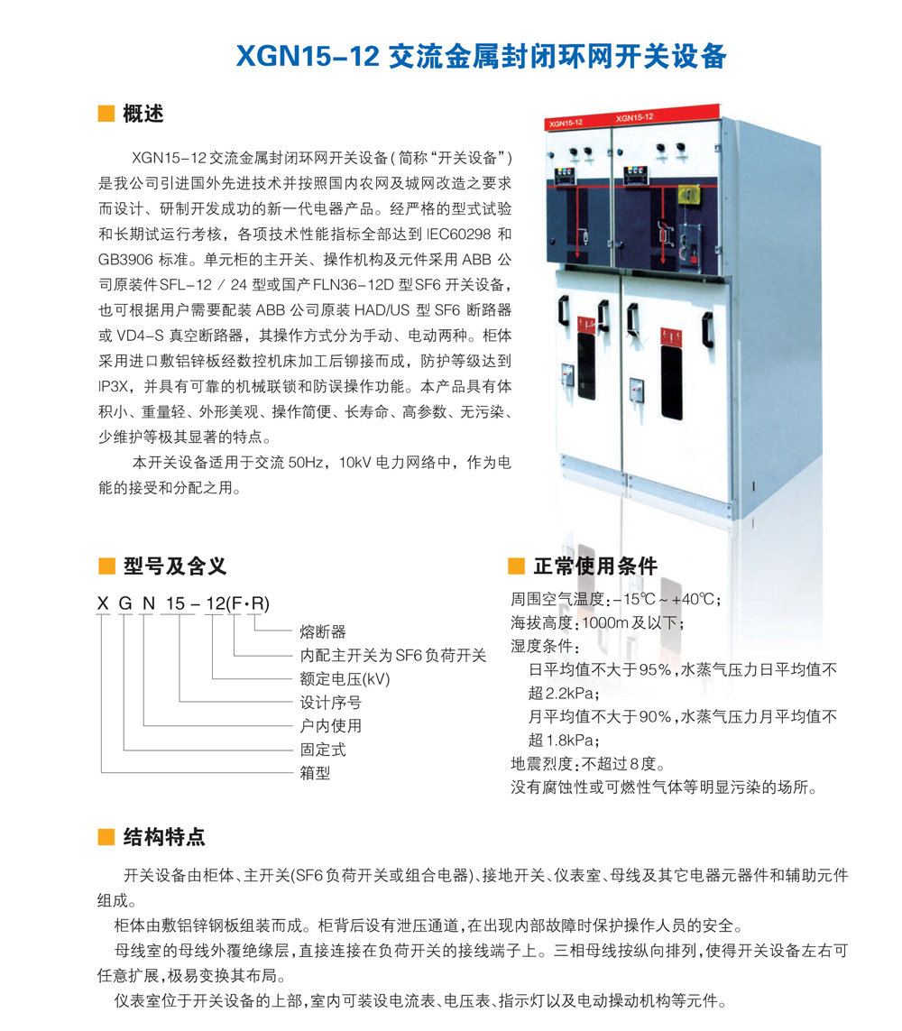 XGN15- 12交流金属封闭环网开关设备(简称“开关设备”)是我公司引进国外先进技术并按照国内农网及城网改造之要求而设计、研制开发成功的新-代电器产品。经严格的型式试验和长期试运行考核,各项技术性能指标全部达到1IEC60298和GB3906标准。单元柜的主开关、操作机构及元件采用ABB公司原装件SFL-12 / 24型或国产FLN36- 12D型SF6开关设备,也可根据用户需要配装ABB公司原装HAD/US型SF6断路器或VD4- -S真空断路器,其操作方式分为手动、电动两种。