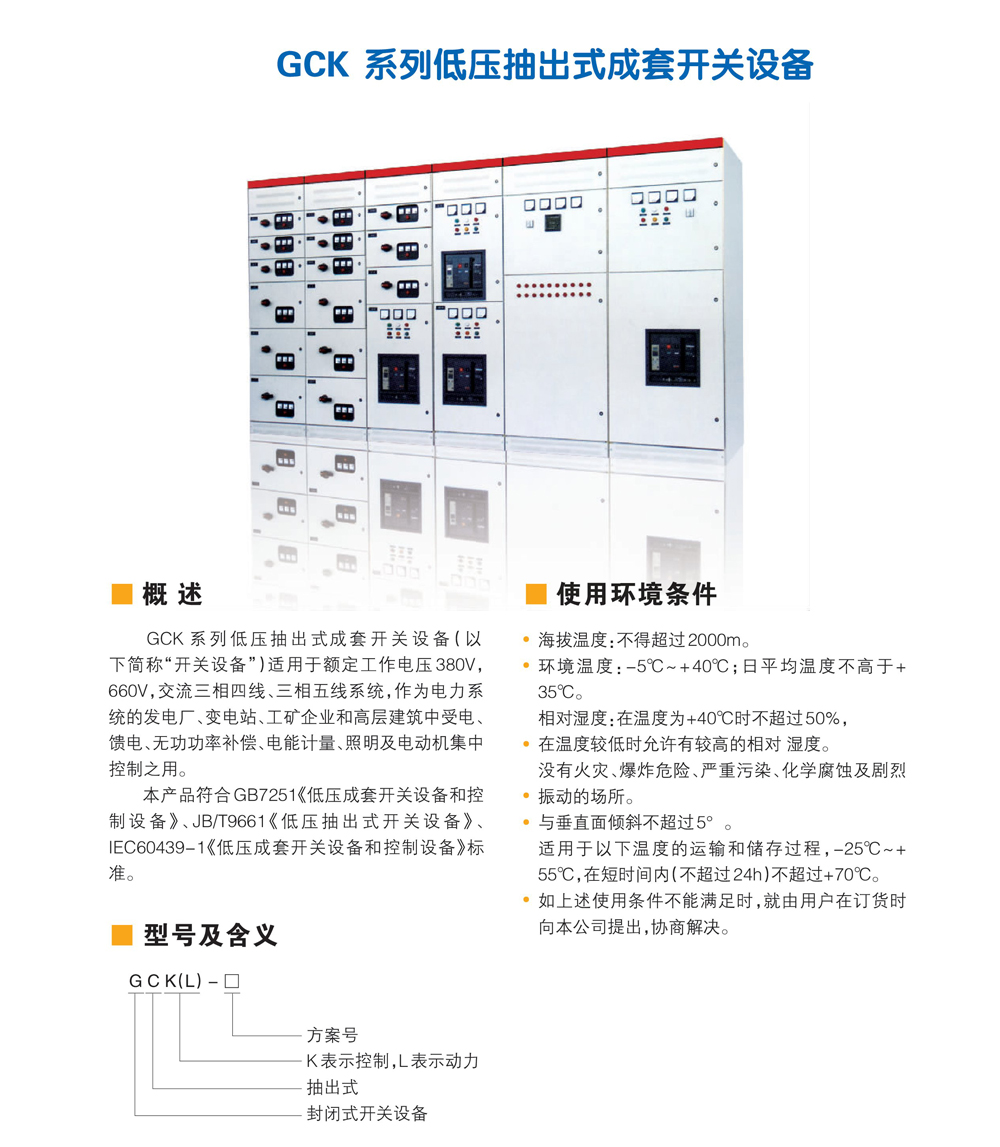 本产品符合GB7251《低压成套开关设备和控制设备》、JB/T9661《低压抽出式开关设备》、IEC60439-1《低压成套开关设备和控制设备》标准。" />