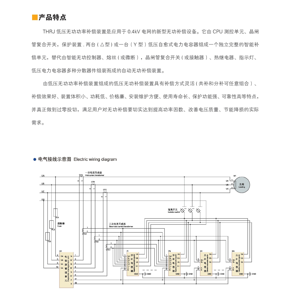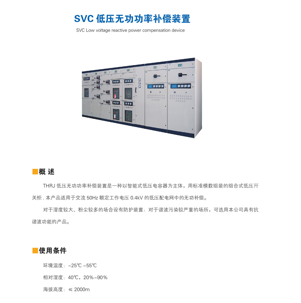 THRJ低压无功功率补偿装置是-种以智能式低压电容器为主体,用标准模数组装的组合式低压开关柜。本产品适用于交流50Hz额定工作电压0.4kV的低压配电网中的无功补偿。