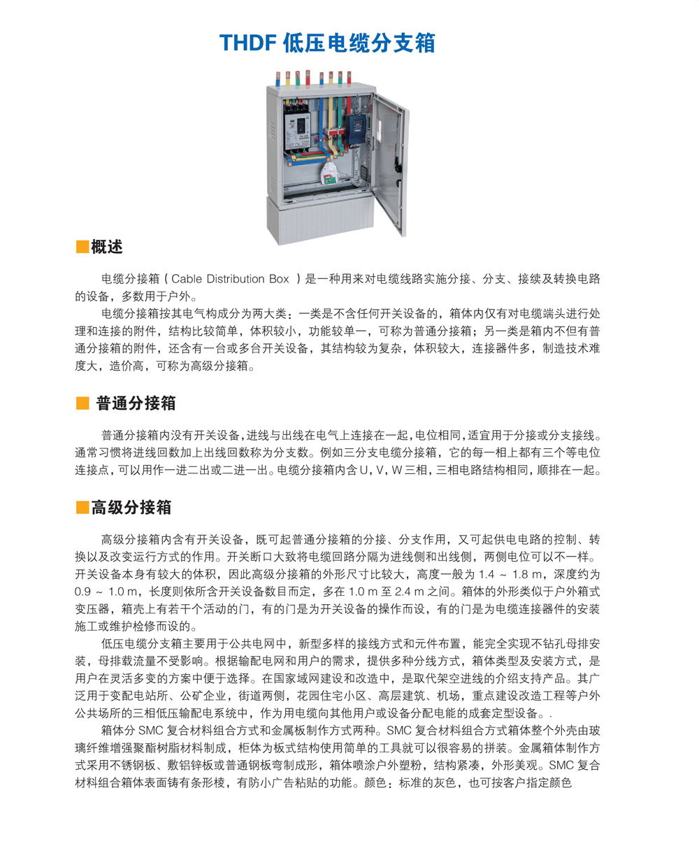 电缆分接箱按其电气构成分为两大类: -类是不含任何开关设备的,箱体内仅有对电缆端头进行处理和连接的附件,结构比较简单,体积较小,功能较单一,可称为普通分接箱;另一类是箱内不但有普通分接箱的附件,还含有一台或多台开关设备,其结构较为复杂,体积较大,连接器件多,制造技术难.度大,造价高,可称为高级分接箱。